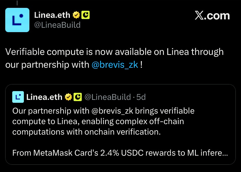 Verifiable zk compute, solves complex onchain computation is now live on Linea thanks to Brevis zk