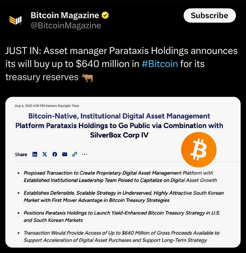 Parataxis Holdings is merging with SPAC SilverBox Corp IV to go public on the NYSE as PRTX, aiming to raise up to $640M to build a Bitcoin treasury, starting with $31M in BTC to drive institutional growth in US and South Korea
