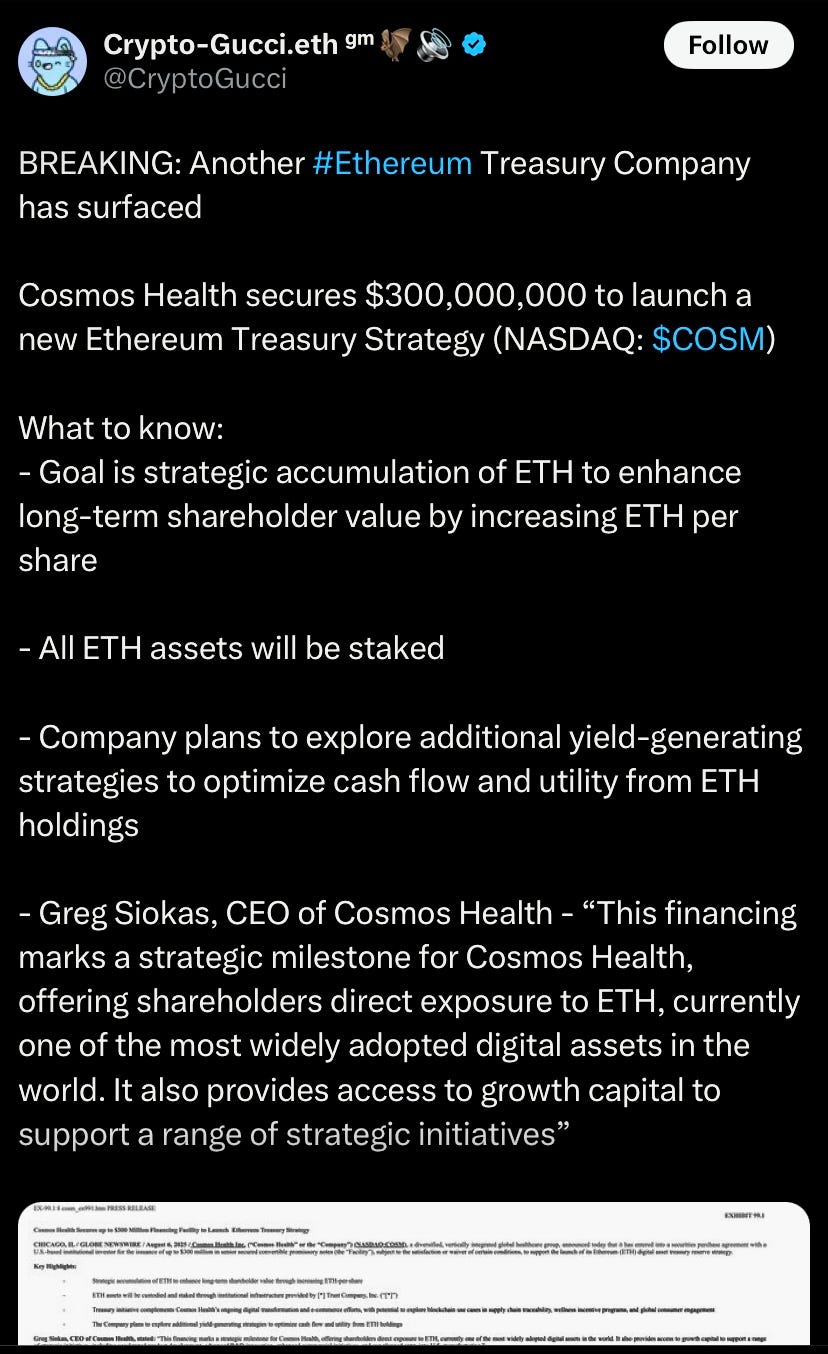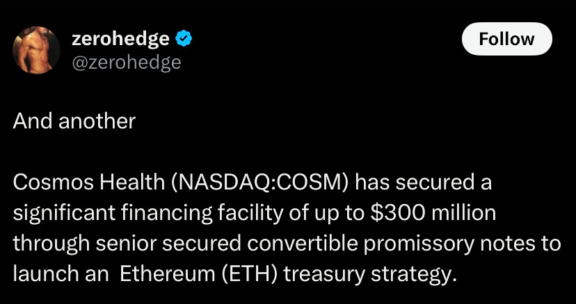 Cosmos Health secured a $300M convertible notes financing to establish an ETH treasury reserve