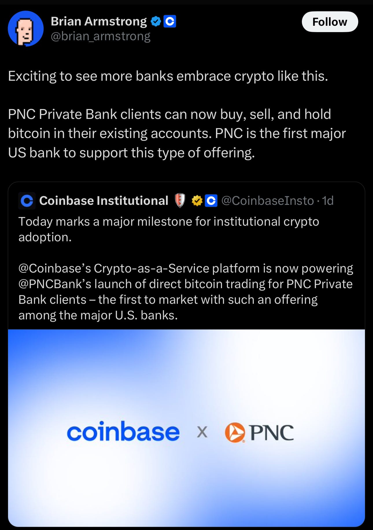 PNC Bank now offers spot bitcoin trading to private banking clients via Coinbase institutional trading infrastructure
