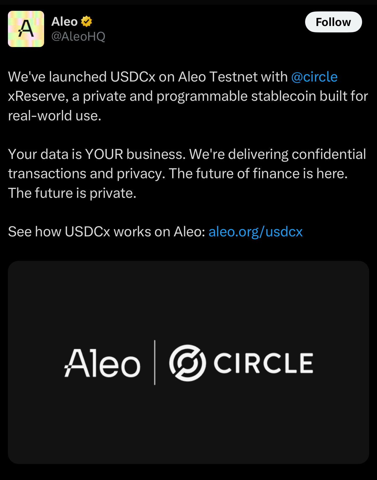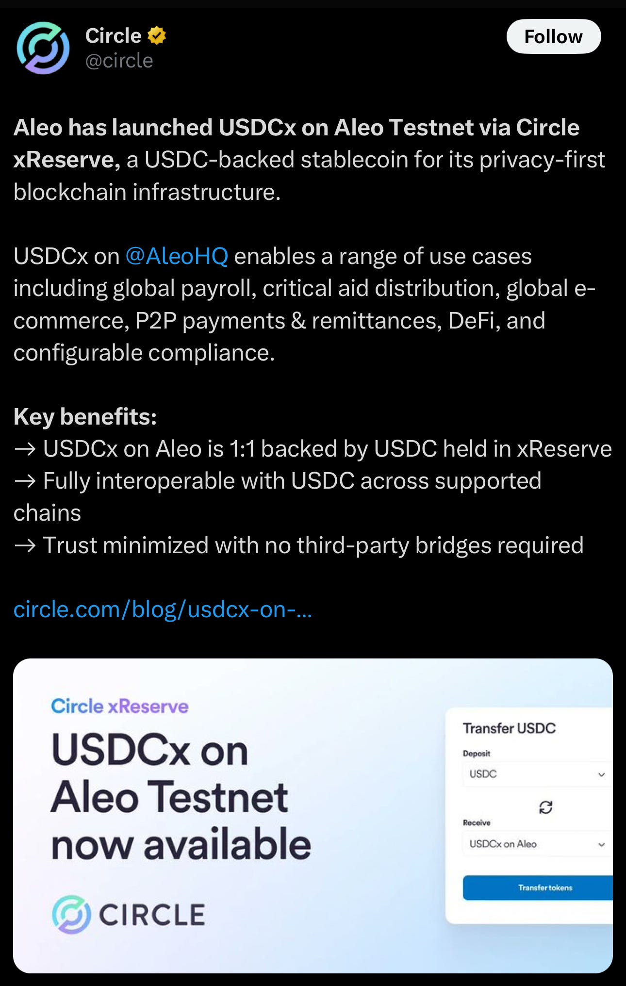 Circle is testing new private stablecoin, USDCx on privacy L1 Aleo, offering bank-level privacy with compliance records using zkSNARKS