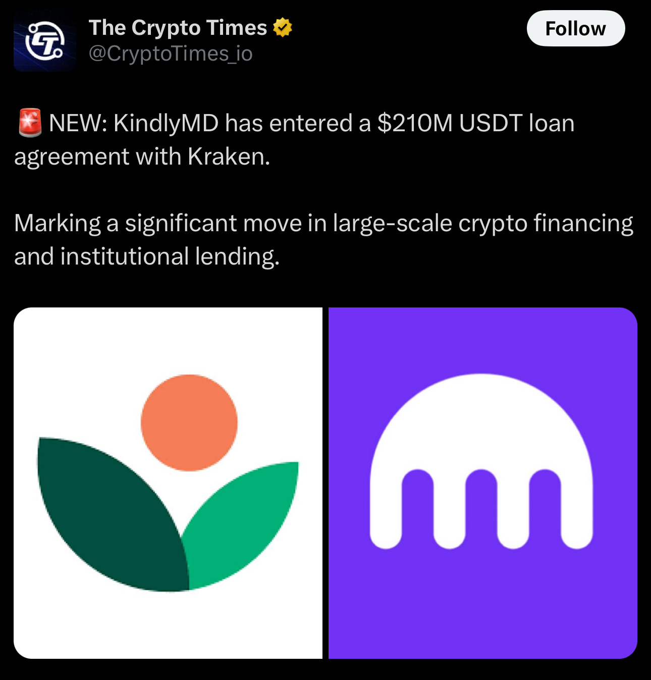 Utah based KindlyMD’s subsidiary Nakamoto Holdings secured a $210M USDT one-year loan from Kraken at 8% annual fee, backed by minimum $323.4M in BTC collateral held in Kraken custody, maturing in Dec 2026.​​​​​​​​​​​​​​​​