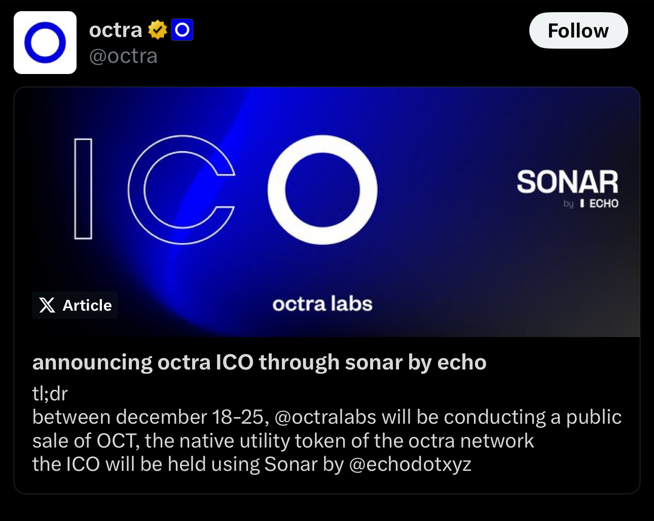Privacy chain, Octra to hold a $20M public token sale on Sonar on Dec 18 at $200M valuation.​​​​​​​​​​​​​​​​