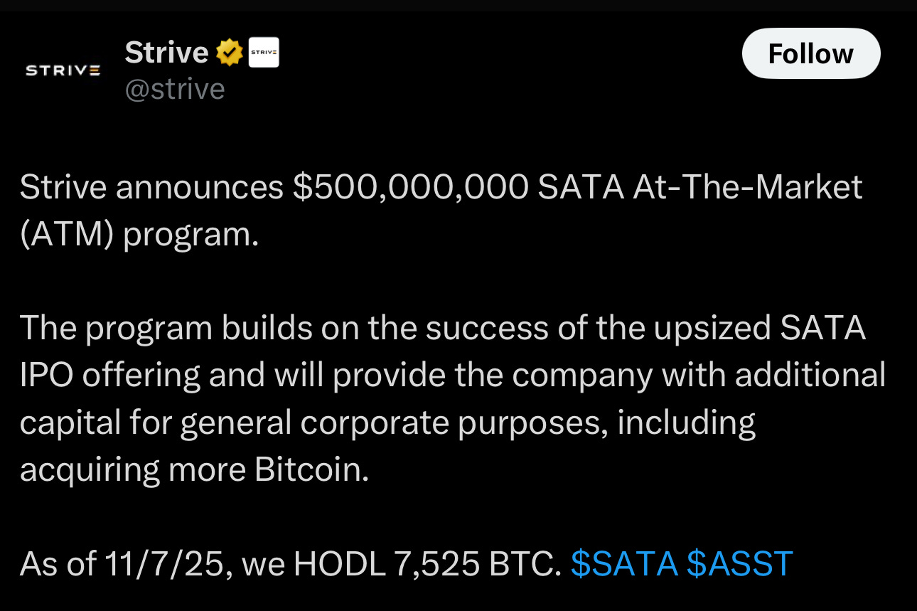 Nasdaq-listed Strive is selling up to $500M of preferred stock through major brokers to buy more bitcoin for its treasury and fund operations.​​​​​​​​​​​​​​​​