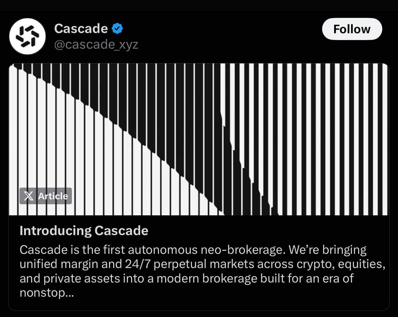 Cascade raised $15M seed funding led by Polychain and Variant to build a decentralized neo-brokerage offering 24/7 perpetual trading markets for all assets