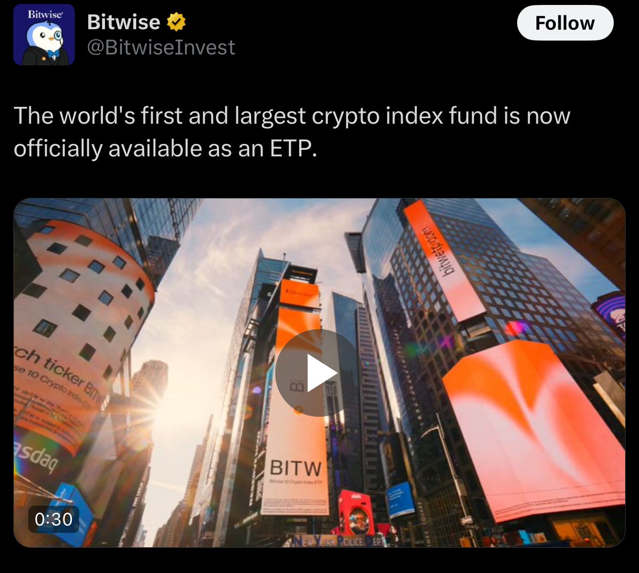 Bitwise 10 Crypto Index fund is live as an ETF on NYSE Arca