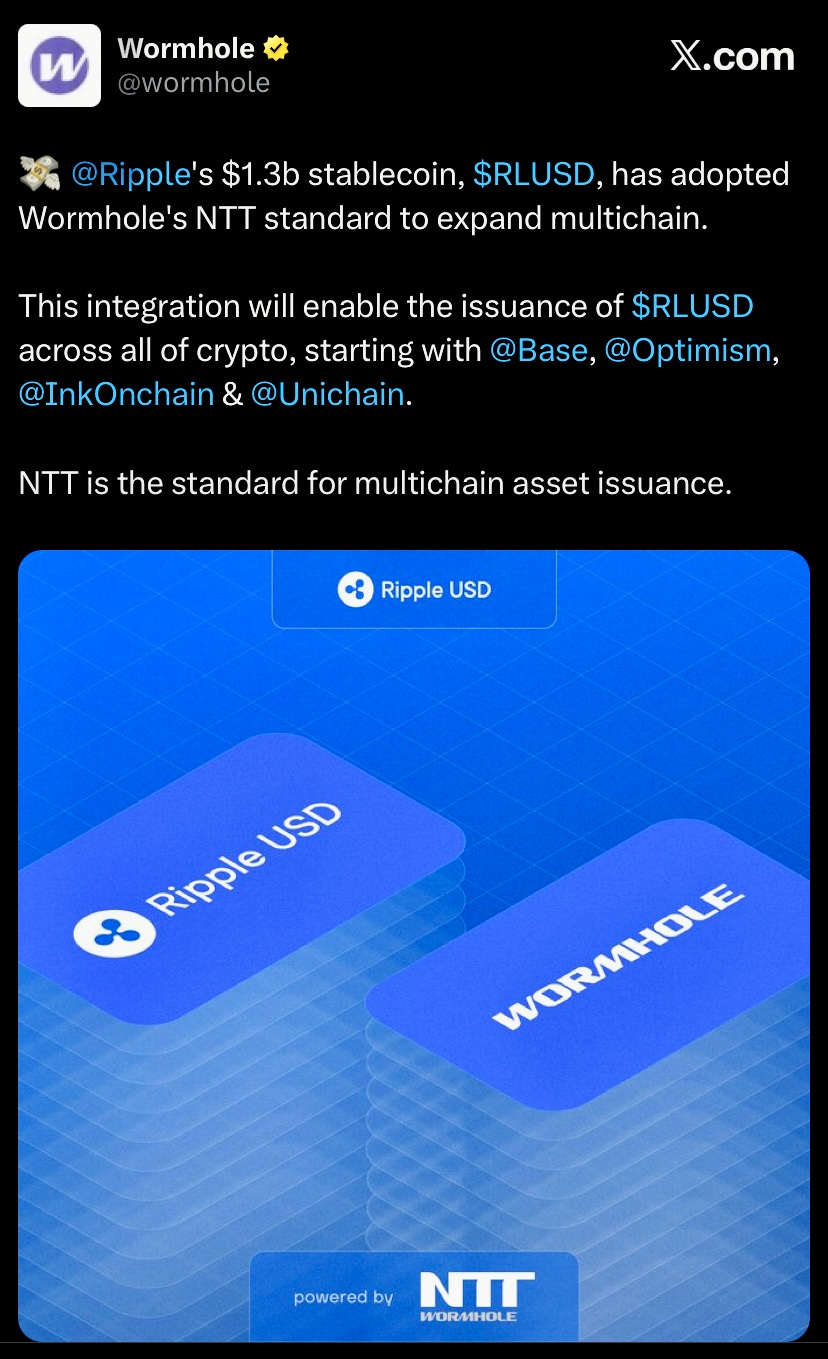 Ripple taps Wormhole adopting their NTT standard to expand issuance of RLUSD across ETH L2s (Optimism, Unichain, Ink Chain, Base)