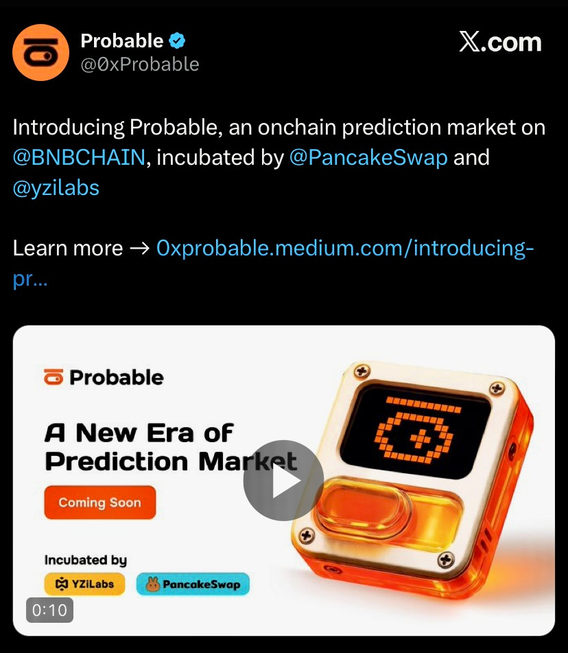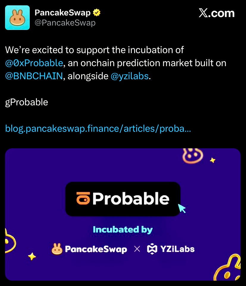 Pancake introduced Probable, a prediction marketplace incubated by them, launching soon.