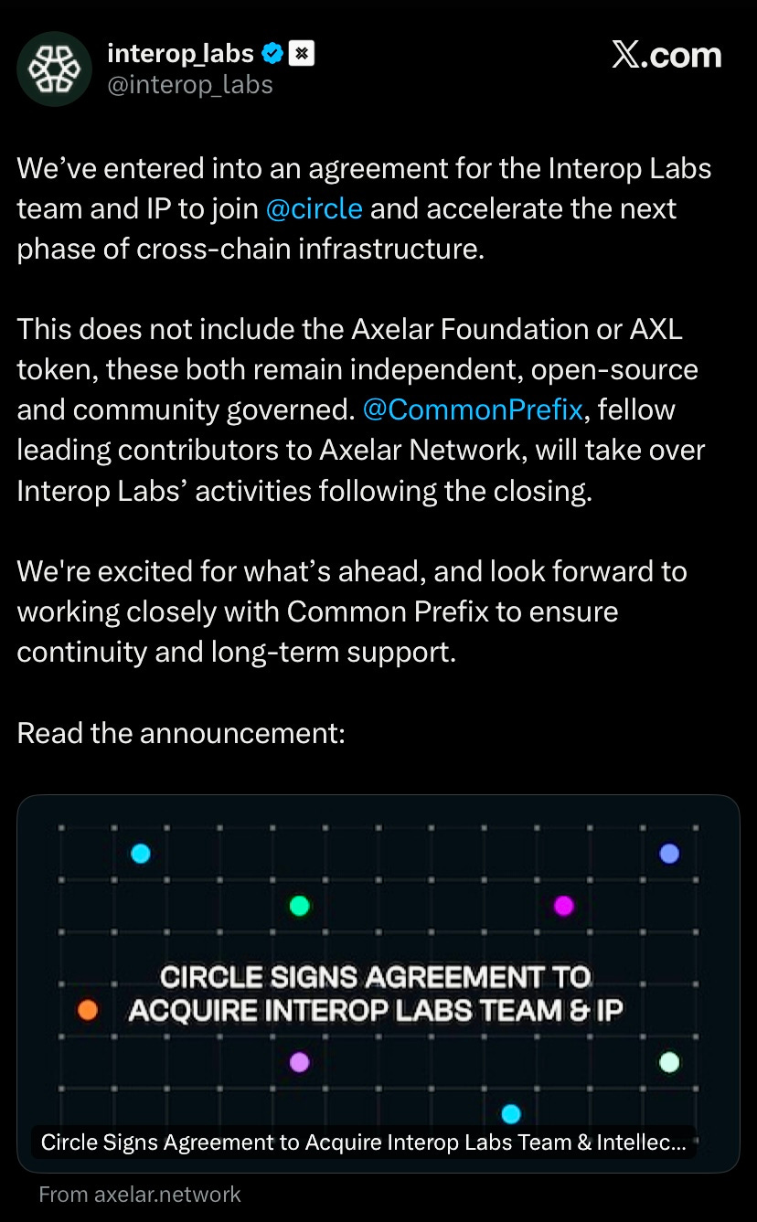 Circle acquired Interop Labs, the team behind Axelar, with Common Prefix set to lead Axelar going forward