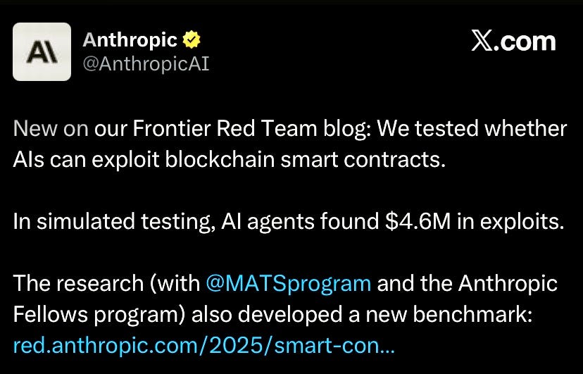 AI Research, Anthropic warned that increasingly powerful, AI agents can now autonomously find and exploit smart-contract vulnerabilities at scale, noting that their Claude Opus 4.5 and Claude Sonnet 4.5 exploited 17 of 34 recently hacked contracts in tests and stole $4.5 million in simulated funds , highlighting the urgent need to use AI to strengthen blockchain security.