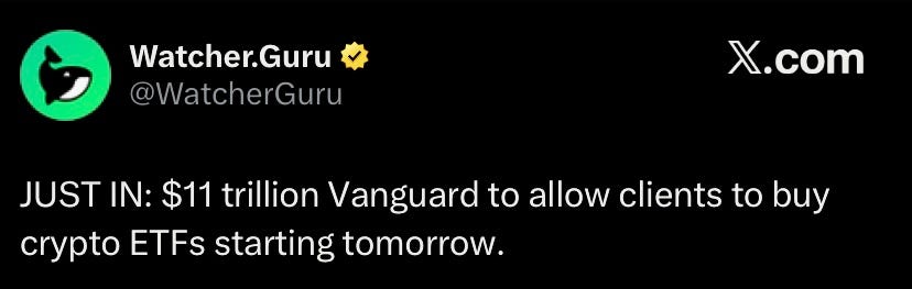 Marking a significant shift, Vanguard will begin allowing ETFs and mutual funds that primarily hold cryptocurrencies like BTC, SOL, XRP, and ETH to trade on its platform starting today, despite CEO Salim Ramji saying as recently as August 2024 that the firm had no plans to offer crypto products.