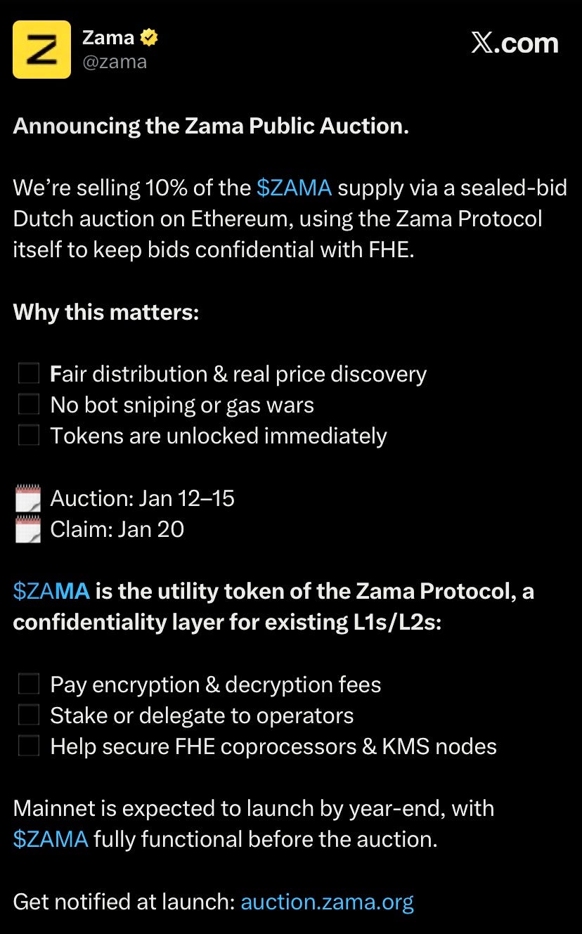 Zama announced launch of a sealed-bid Dutch auction on Ethereum to sell 10% of its ZAMA token supply, with registration opening Dec. 14, bidding set for Jan 12–15, and claims starting Jan 20, using FHE powered confidentiality and a clearing price mechanism that refunds all bids below the final price, while bids at or above the clearing price are filled at that price, with any excess refunded.
