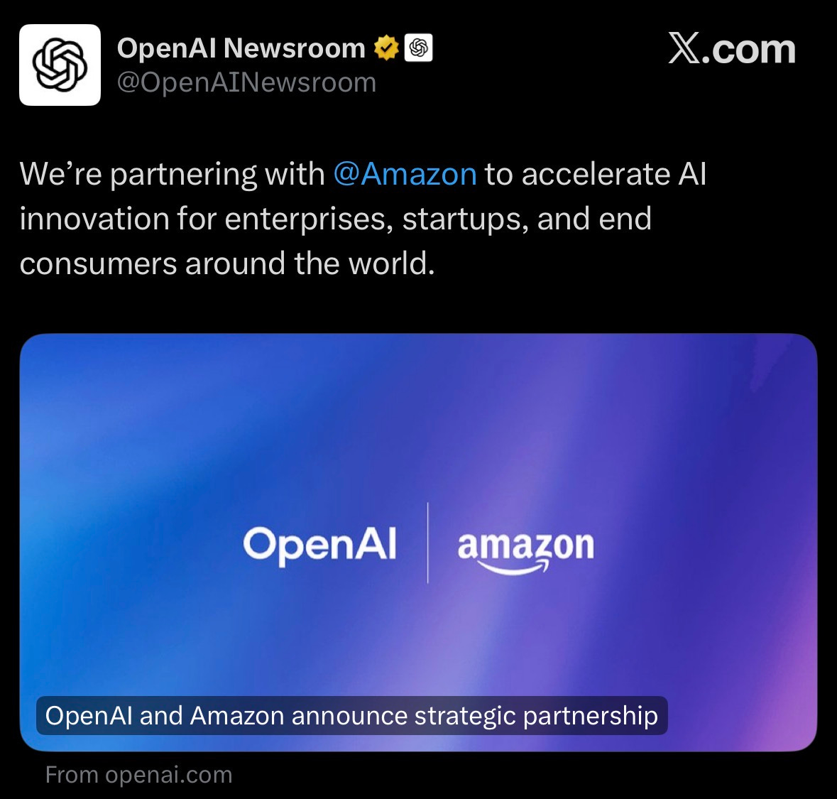 OpenAI and Amazon announced a multi-year partnership to accelerate AI innovation for enterprises, startups, and consumers.