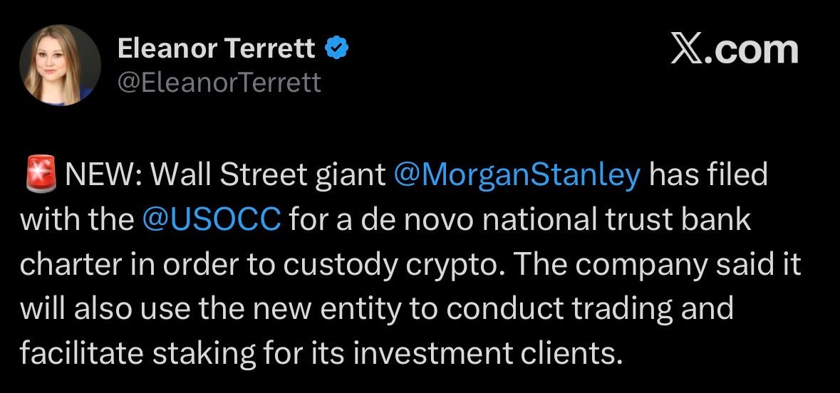 Morgan Stanley filed for a de novo national trust bank charter to custody crypto