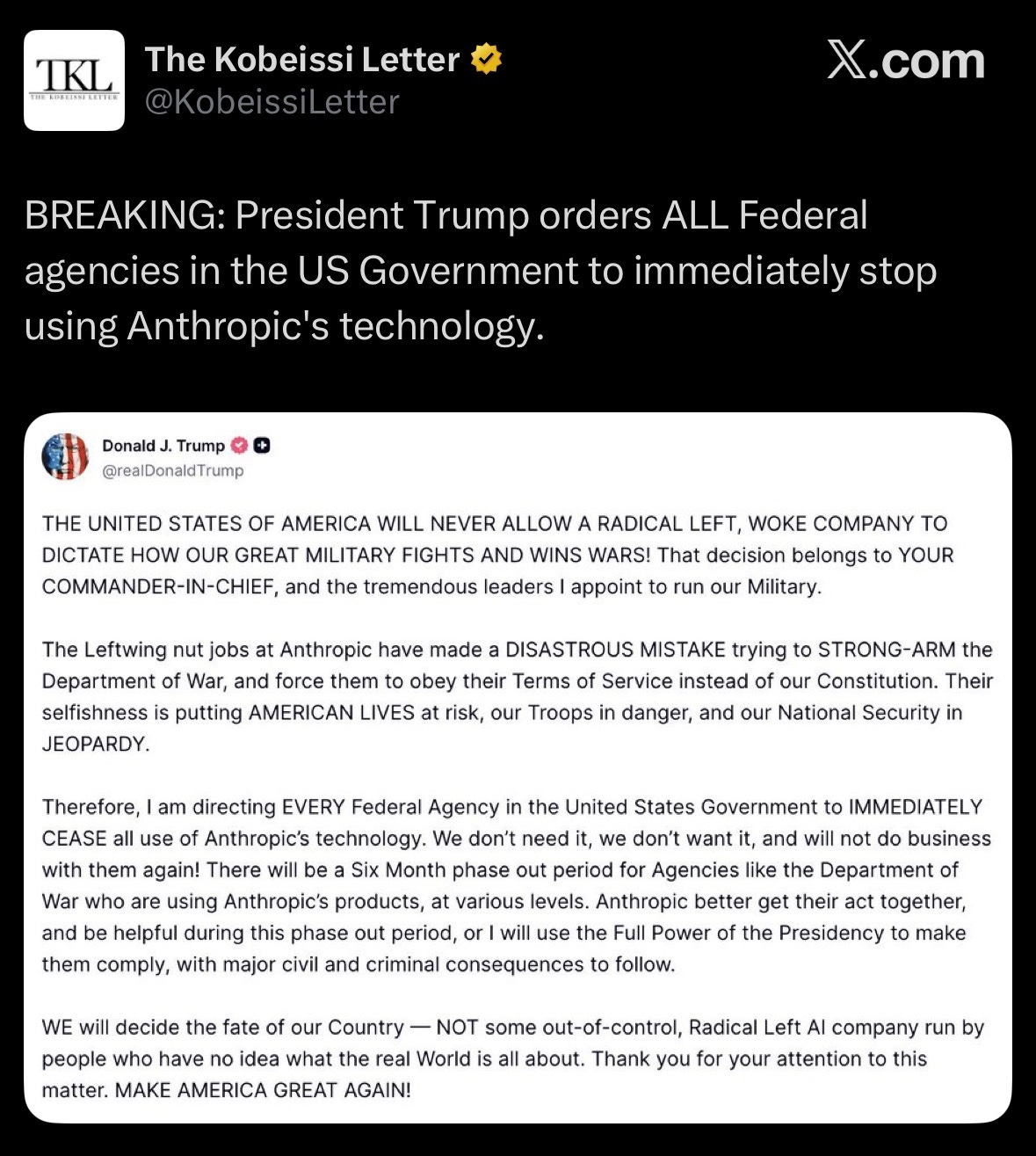 Trump directed all federal agencies to stop using Anthropic technology after the company refused to remove AI safeguards on surveillance and autonomous weapons.