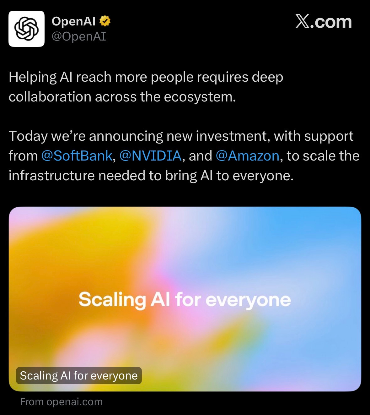 OpenAI raised $110B at $730B valuation, with $30B each from SoftBank and NVIDIA, and $50B from Amazon.