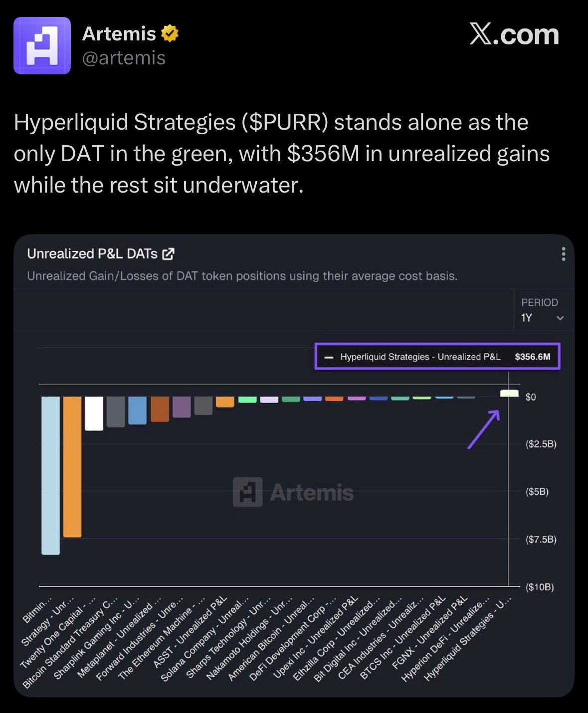 Artemis data shows Hyperliquid Strategies PURR has $356M in unrealized gains, while other DATs, including Bitmine, face multi-billion-dollar unrealized losses.