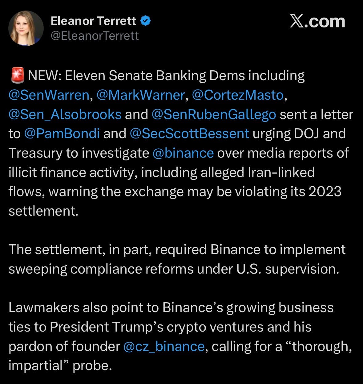 Senate Democrats, led by Sen. Chris Van Hollen, urge AG Bondi and Treasury Secretary Bessent to review Binance’s sanctions compliance over alleged trades with Iranian entities.