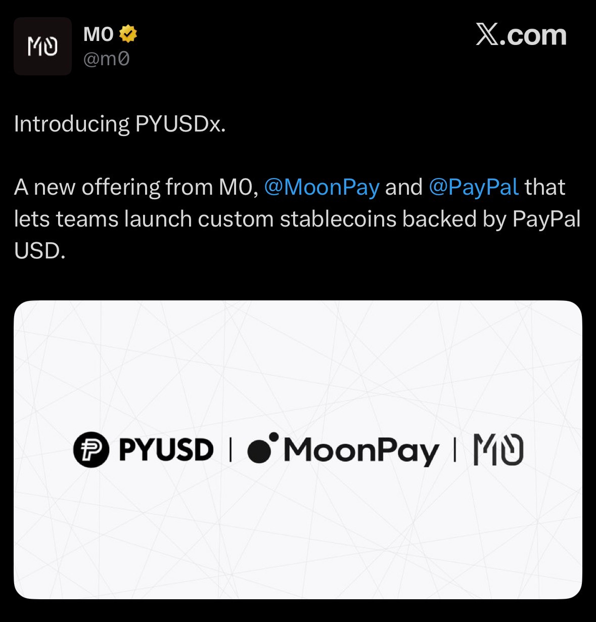 MoonPay and M0 launched PYUSDx, a framework that lets developers issue app-specific stablecoins backed by PYUSD.