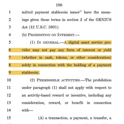 US Senators propose Stablecoin Bill to restrict exchanges from paying its users interest on holding stablecoins. However it allows exceptions for activity-based rewards or incentives linked to actions such as making transactions, staking, providing liquidity, or posting collateral.
