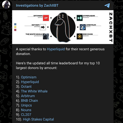 The Hyperliquid Foundation donated 10,000 HYPE tokens, valued at approximately $254,000, to ZachXBT, his second-largest donation to date