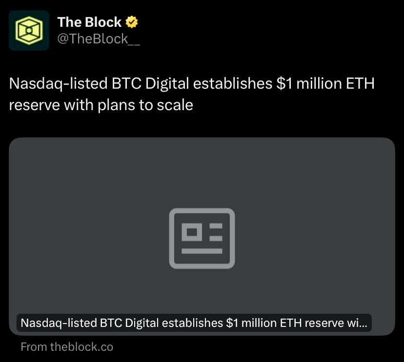Nasdaq listed BTC mining firm, BTC Digital announced a $1M Ethereum reserve. This move is part of their broader plan to expand into ETH onchain including DeFi, stablecoins, and asset tokenization.