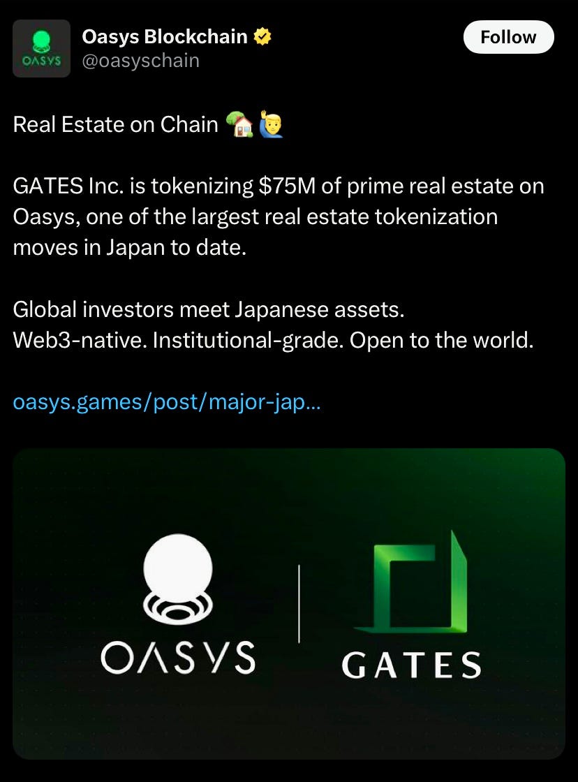 GATES Inc is bringing $75M worth of Tokyo real estate on-chain using Oasys blockchain, with plans to scale that to over $200B, that’s about 1% of Japan’s property market. This is a huge move for both sides. GATES is a serious player with $145M in revenue and prepping for a NASDAQ listing, and choosing Oasys shows real confidence in the chain’s ability to handle real world asset tokenization at scale. Oasys, OAS started as a gaming chain is now stepping into RWA space starting with Gates Inc