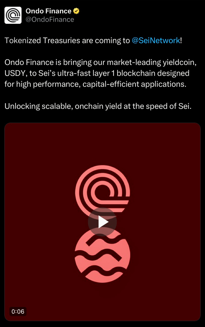 Ondo is bringing its tokenized Treasury product, USDY, to Sei, marking the first RWA launch on SEI, fast L1. USDY gives users on Sei access to onchain yield backed by US Treasuries and bank deposits.