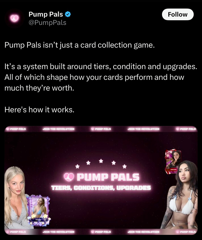 Pump Pals is an NSFW fantasy card game built on Fluent, where you collect and upgrade model-themed cards. Cards come in five tiers (Bronze to Diamond) and have condition ratings (1–5). Higher tiers boost in-game performance, while better condition increases resale and collector value. Combine same-tier cards to upgrade, but risk losing condition in the process. Strategy, value, and fantasy collide in Pump Pals.
