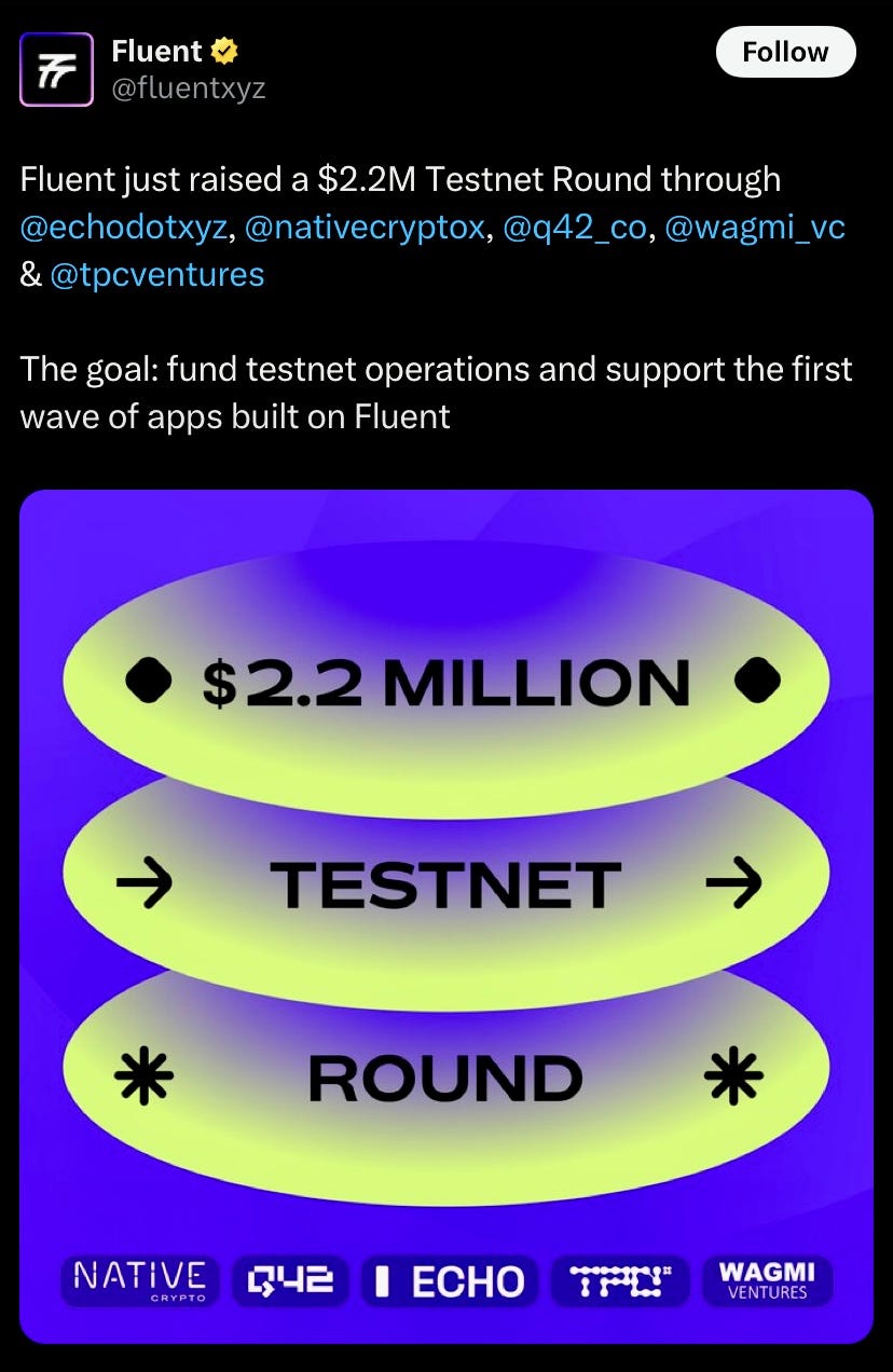 Fluent raised $2.2M in a Testnet Round from echo etc, the funds will power testnet operations and support the first wave of apps building on Fluent.
