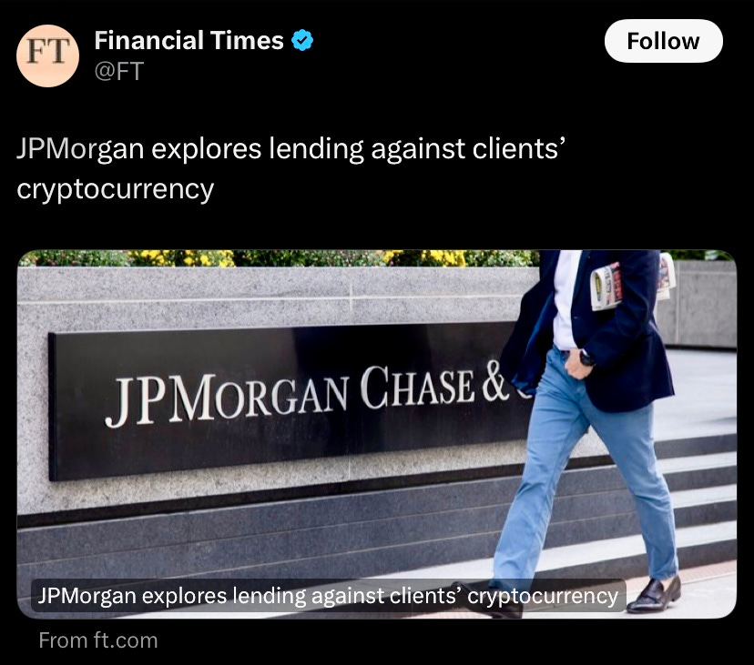 According to FT, JPMorgan Chase is considering allowing customers to borrow against their crypto holdings as early as next year