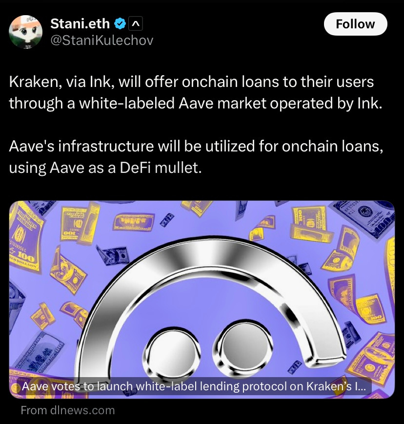 Aave DAO has approved a proposal allowing the Kraken backed Ink chain, to launch a white label version of Aave V3 (use Aave v3 tech but branding and control, Ink’s)