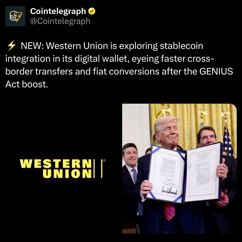 Western Union CEO told Bloomberg they’re exploring ways to integrate stablecoins into its digital wallet infrastructure