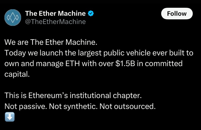 Pantera backed Ether Machine raised $1.5B to use 400k ETH to offer institutions direct, regulatory compliant access to ETH defi yield