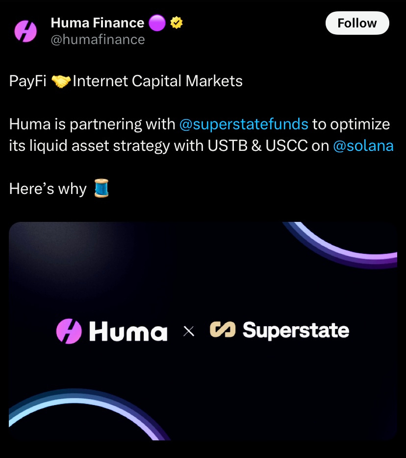 Huma Finance has partnered with Superstate to integrate USTB and USCC into its onchain liquidity strategy, combining RWAs with fully compliant, institutional grade infra. Built natively on Solana, onchain capital markets