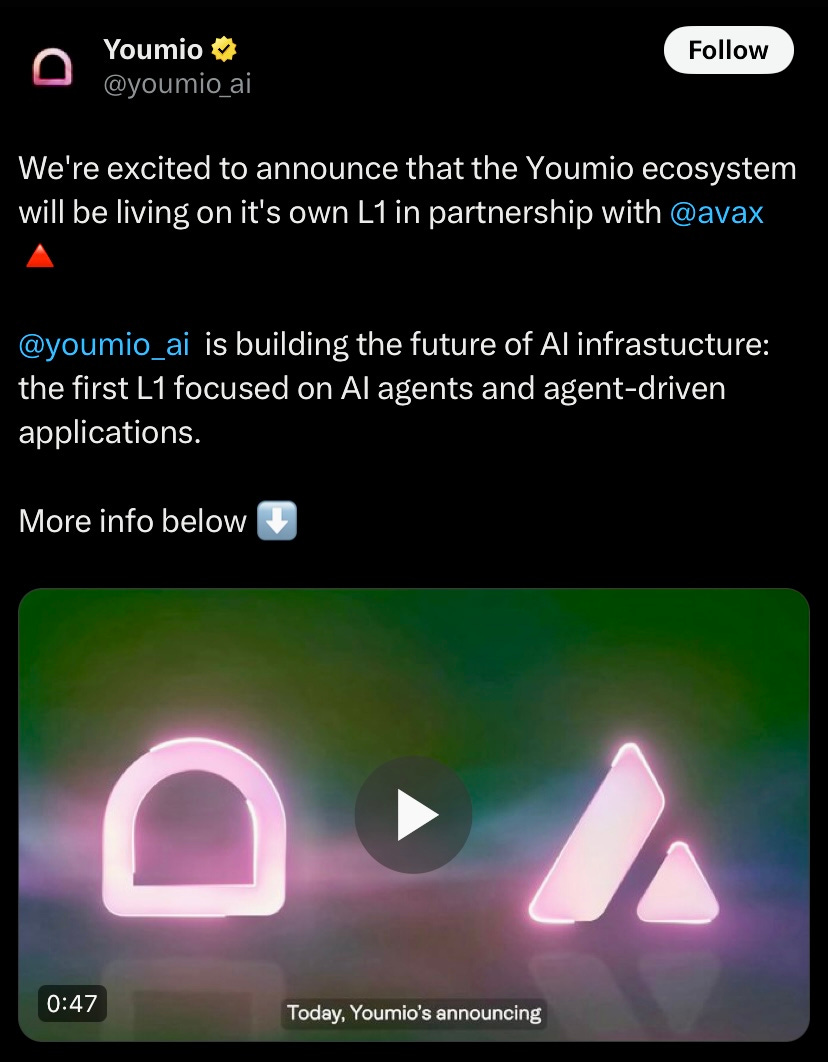 Youmio has announced it will launch its own L1 blockchain in on Avalanche. Youmio will be focused entirely on powering AI agents and agent driven applications