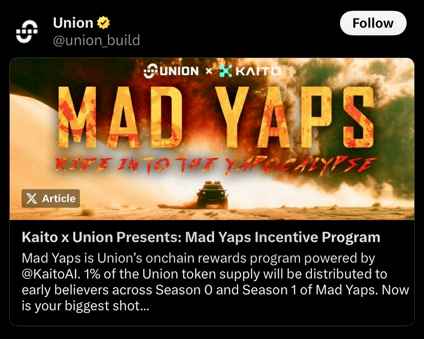zk interoperability network, Union has launched “Mad Yaps,” an onchain rewards program distributing 1% of its total supply across two seasons, where users can earn by creating content, community , and increasing onchain activity to climb their leaderboard