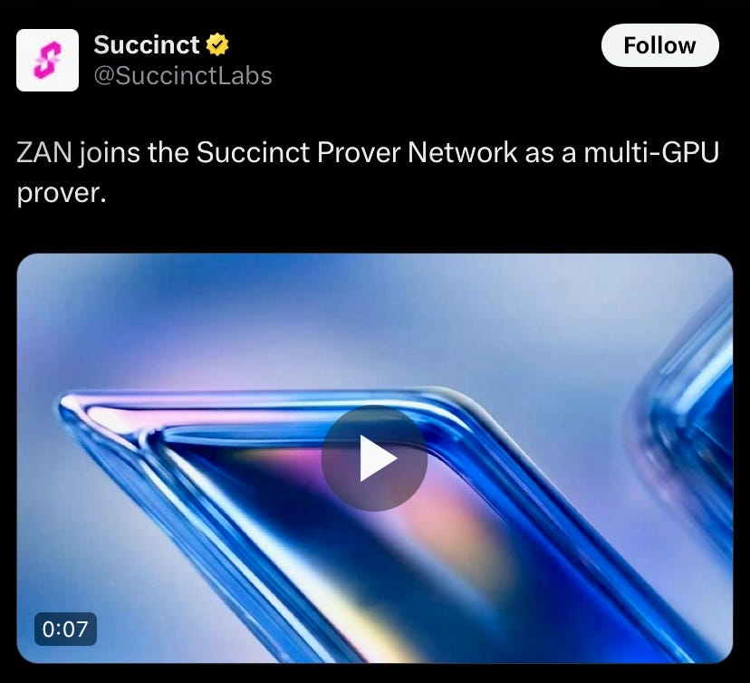 ZAN joins the Succinct Prover Network as a multi GPU prover, bringing 20x SP1 speedups and paving the way for low-cost FPGA and future ASIC based proving.