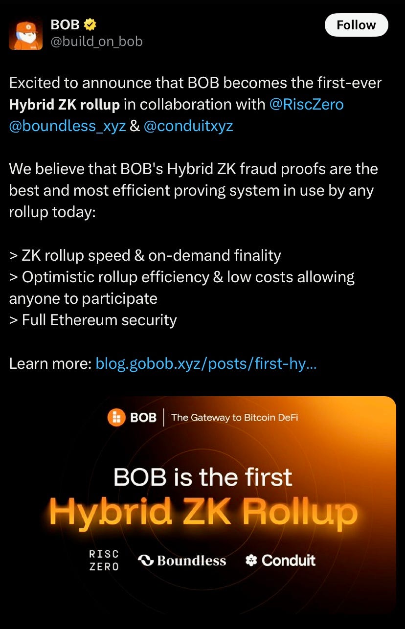 BOB becomes a Hybrid zk Rollup, combining zk finality, and optimistic rollup efficiency, they teamed up with RiscZero, Boundless helping them with zk fraud proofs and rollup infra Conduit. This advanced BOB to Stage 0 on L2Beat, ahead of its upcoming Security Council launch.