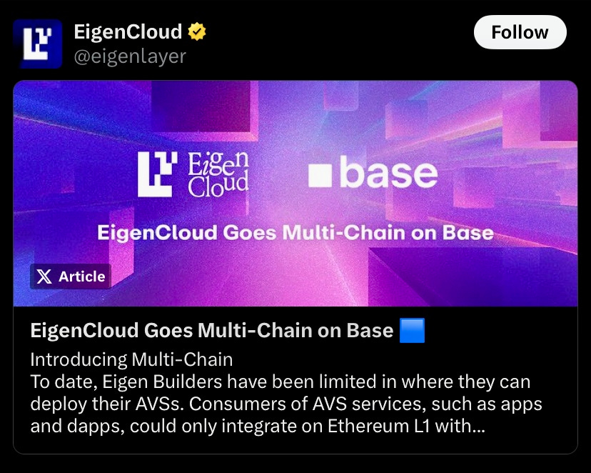 Eigen Labs has launched Multi-Chain Verification (ELIP-008), now live in public preview on Base Sepolia, enabling AVSs to deploy beyond ETH L1 with streamlined integration and lower costs. Mainnet rollout next