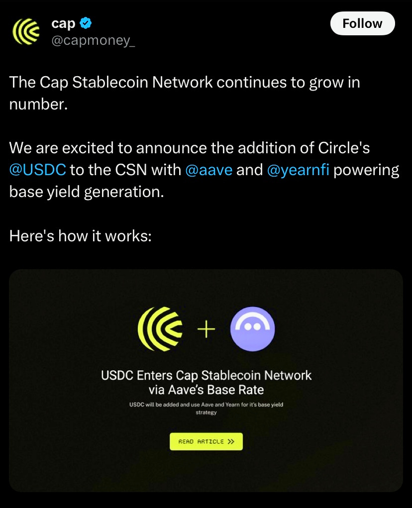 MegaETH DeFi and Cap Stablecoin have announced the integration of USDC into the Cap Stablecoin Network (CSN), enabling users to mint cUSD 1:1 with USDC and swap seamlessly across all CSN dollar assets, powered by Aave and managed by Yearn vaults for yield; this follows after their recent partnership with PayPal.