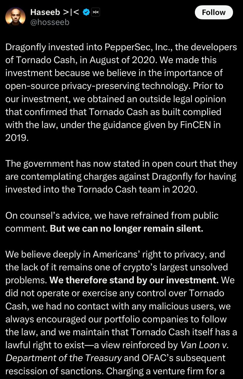 US govt is considering charges against Dragonfly VC for investing in devs behind Tornado Cash, PepperSec Inc in Aug 2020