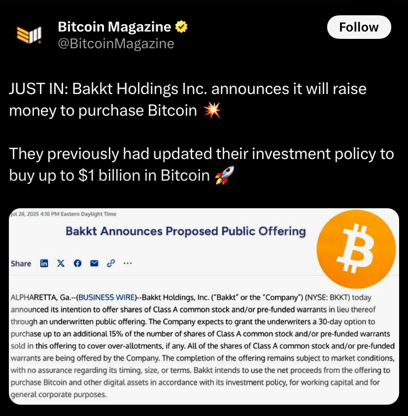 Bakkt is raising $75M through a stock and warrant sale, set to close today. Funds will go towards buying Bitcoin for their treasury. They previously amended their investment policy to allow up to $1 billion BTC purchase.