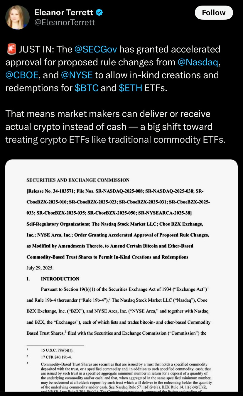 The SEC has approved in-kind creations and redemptions for crypto ETFs, allowing direct swaps of Bitcoin and Ethereum instead of cash. It also gave the go ahead for ETFs holding both spot BTC and ETH, plus options and higher limits.Accelerated approvals were granted to Nasdaq, NYSE Arca, and Cboe BZX