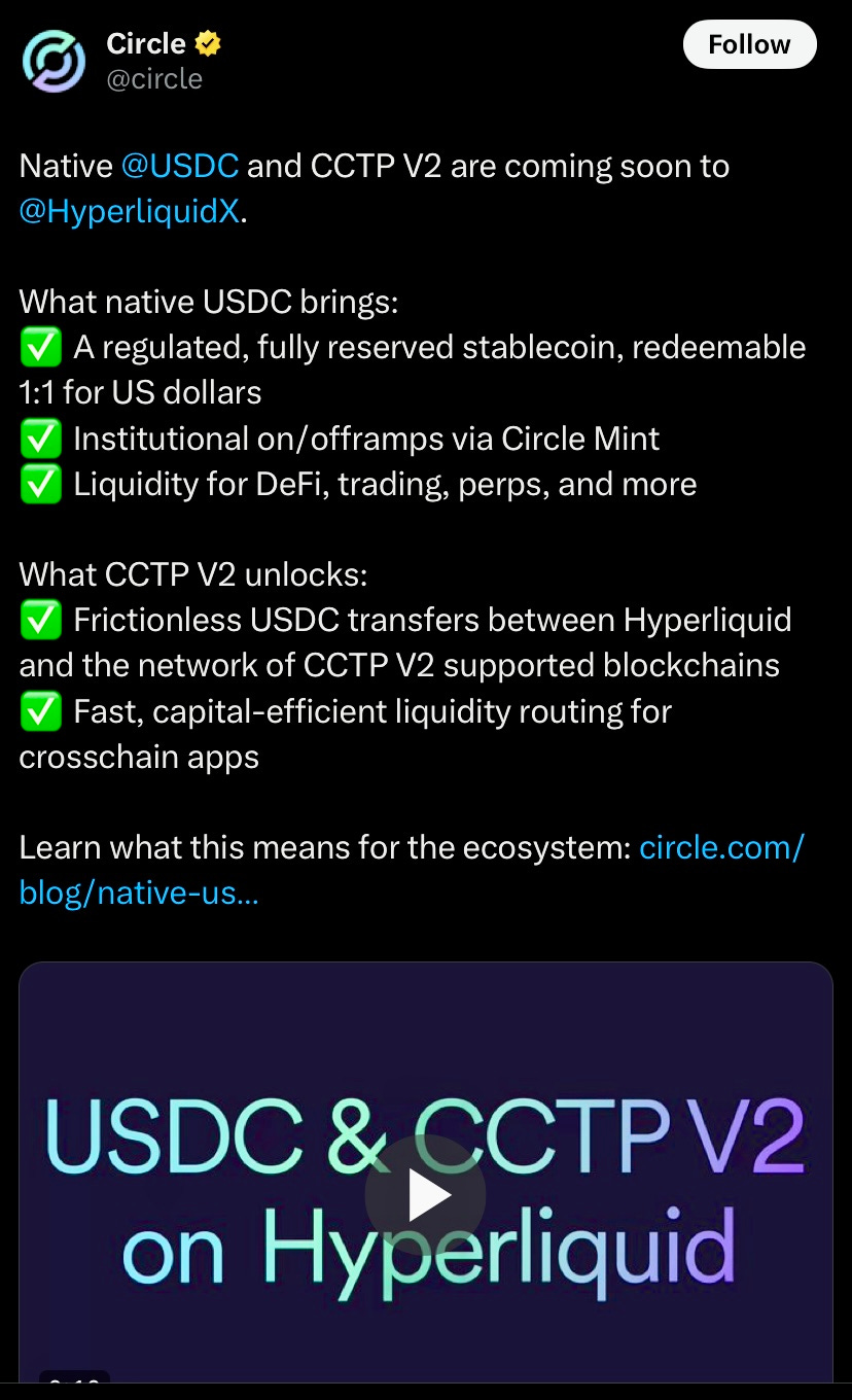 Circle plans to deploy native USDC and CCTP V2 on Hyperliquid