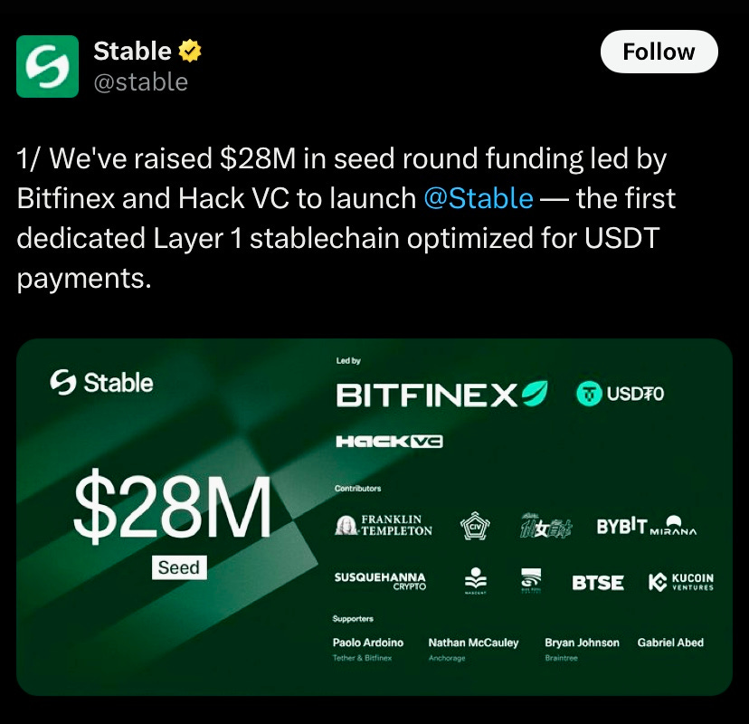 L1 chain Stable, focused on stablecoins has raised $28M in seed funding to build around USDT. Backers include Bitfinex, Hack VC, Franklin Templeton, etc