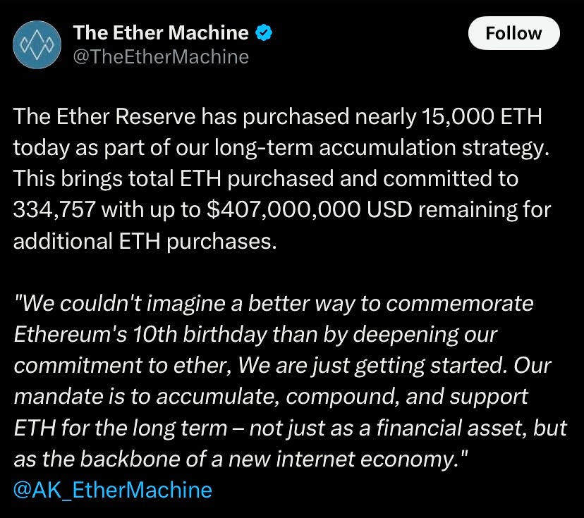 Ether Machine bought 15,000 ETH for $56.9M, bringing its total to 334,757 ETH, surpassing the Ethereum Foundation’s 234k ETH