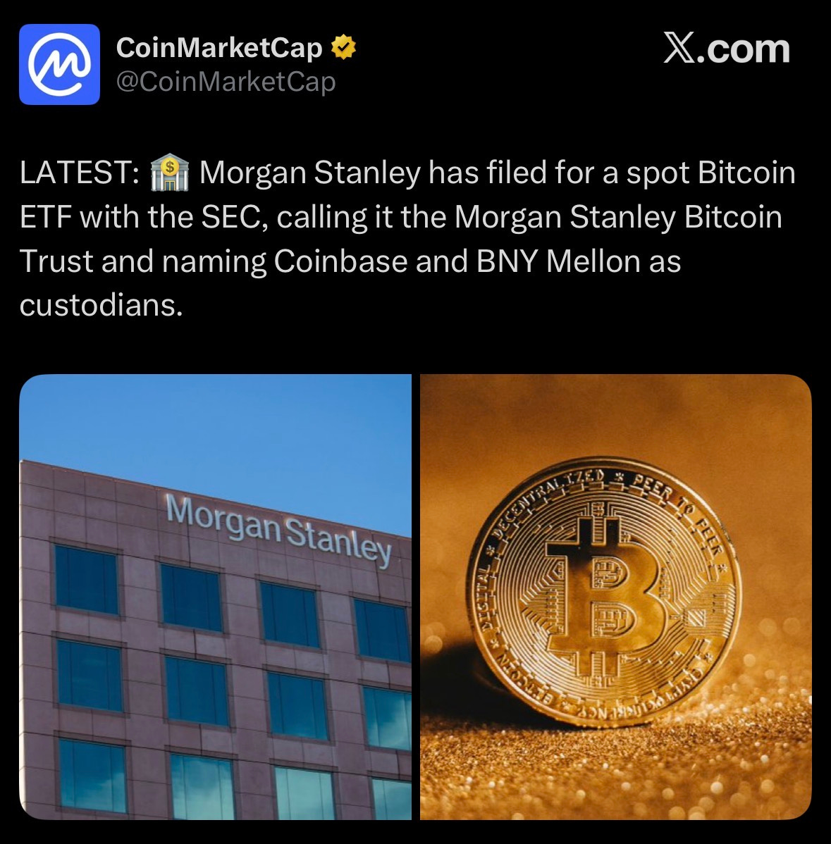Morgan Stanley updated its SEC filing for its proposed Bitcoin Trust, naming Coinbase Custody and BNY Mellon as custodians