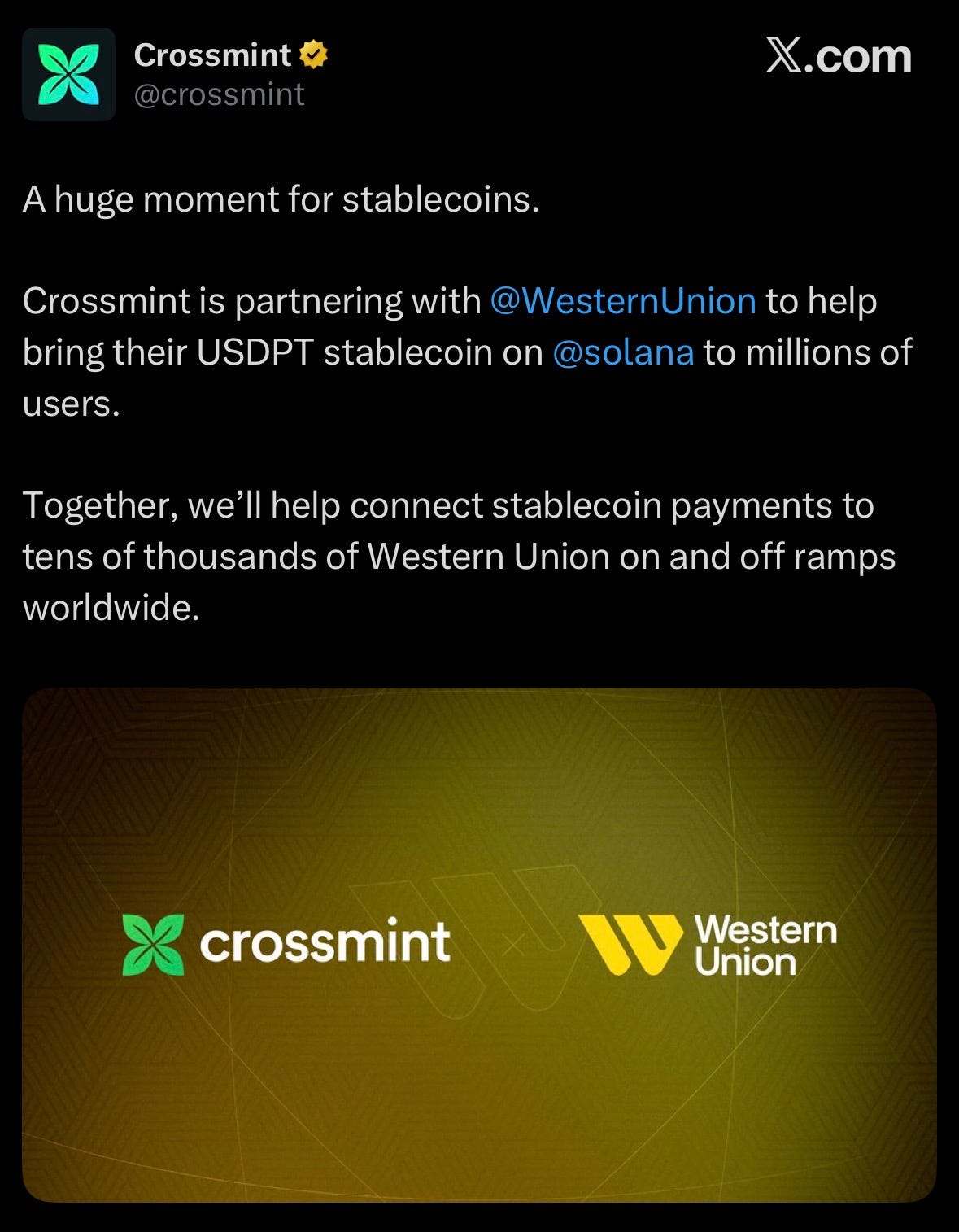 Western Union is launching USDPT stablecoin on Solana in partnership with Crossmint