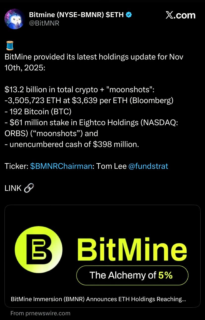 Bitmine added 110,288 ETH to its reserves over the past week, bringing total holdings to 3.5 million ETH